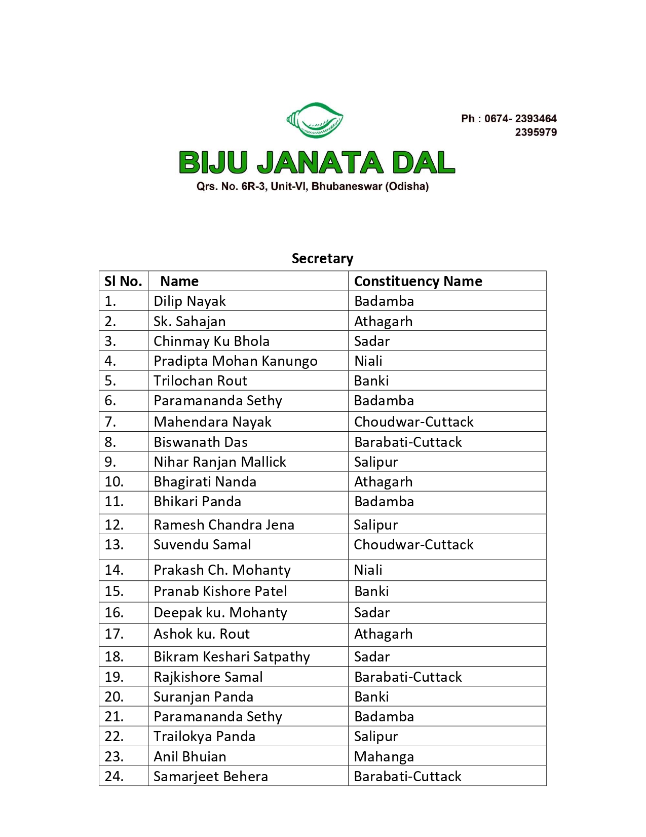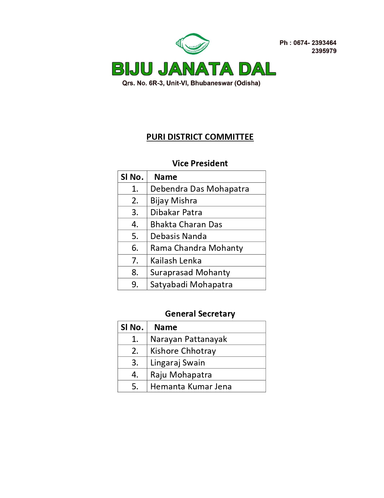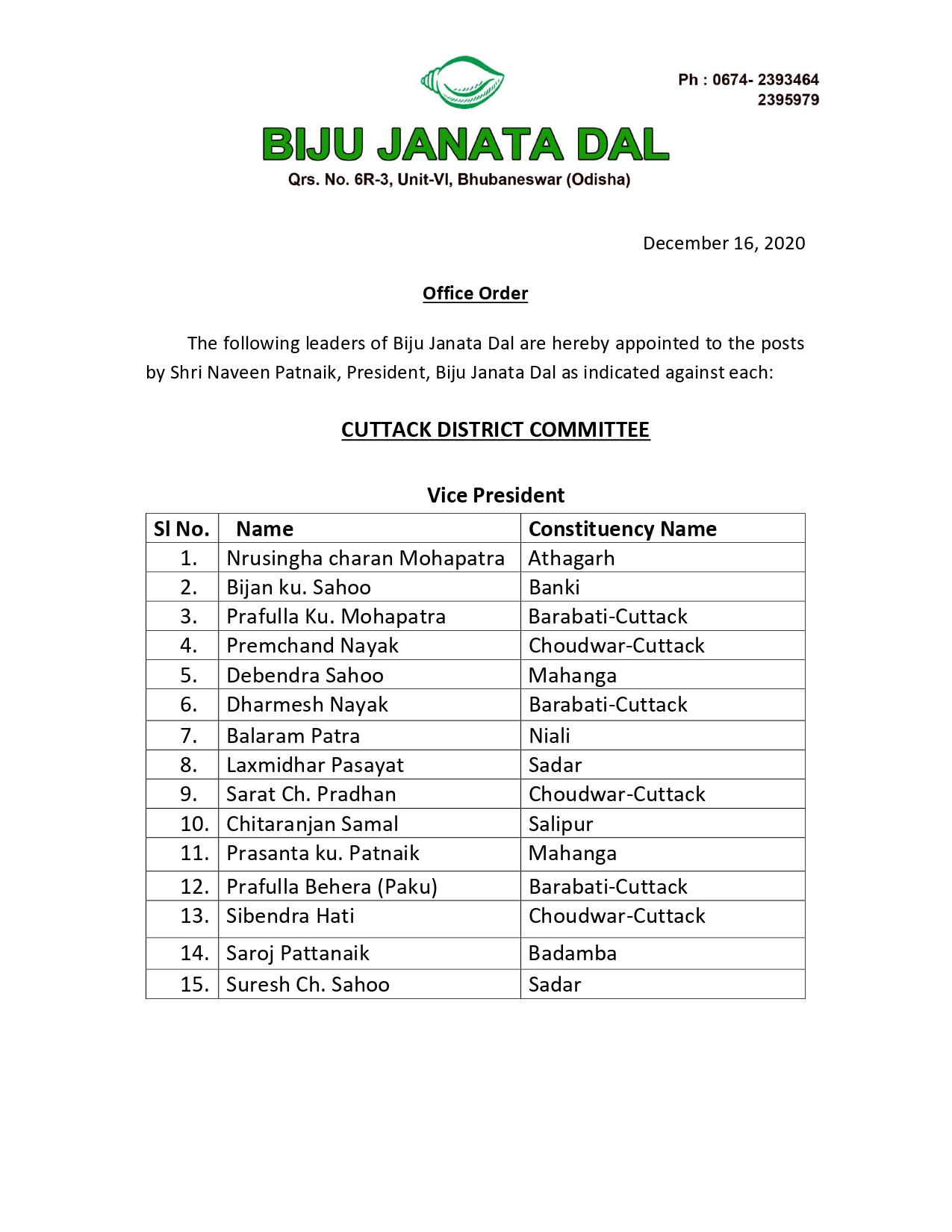 ଭୁବନେଶ୍ବର, ଆଜି ବିଜେଡି ତରଫରୁ ଦୁଇଟି ଜିଲ୍ଲାର କର୍ମକର୍ତ୍ତାଙ୍କ ନାମ ଘୋଷଣା କରାଯାଇଛି। ଏହି ଦୁଇଟି ଜିଲ୍ଲା ହେଲା କଟକ ଏବଂ ପୁରୀ। ଏହି ଦୁଇ ଜିଲ୍ଲାରେ ପ୍ରାୟ 102 ଜଣଙ୍କ ନାମ ପ୍ରକାଶ ପାଇଛି। ଜାଣନ୍ତୁ କେଉଁମାନଙ୍କୁ ଦଳ ବିଭିନ୍ନ ପଦପଦବୀରେ ନିଯୁକ୍ତ ଦେଇଛି।