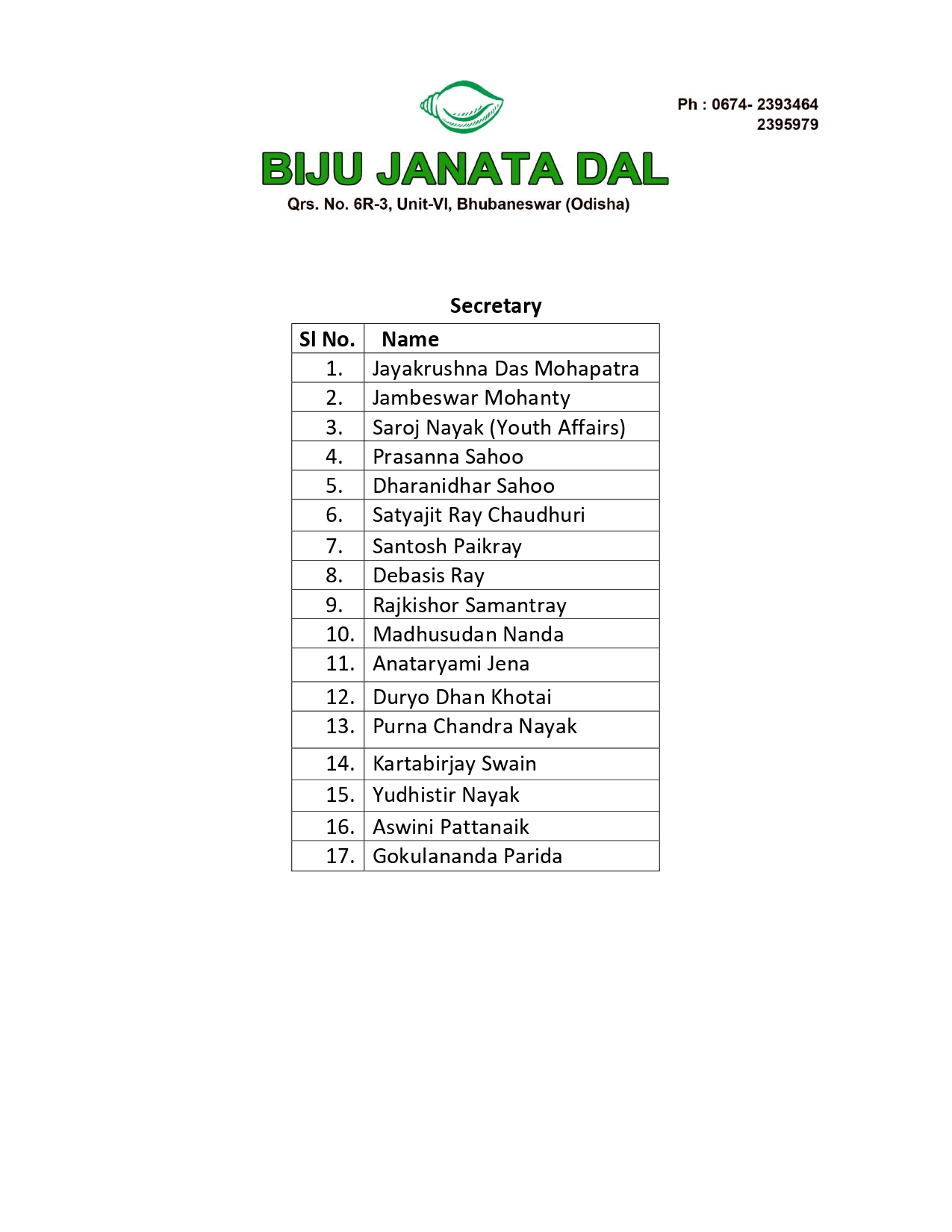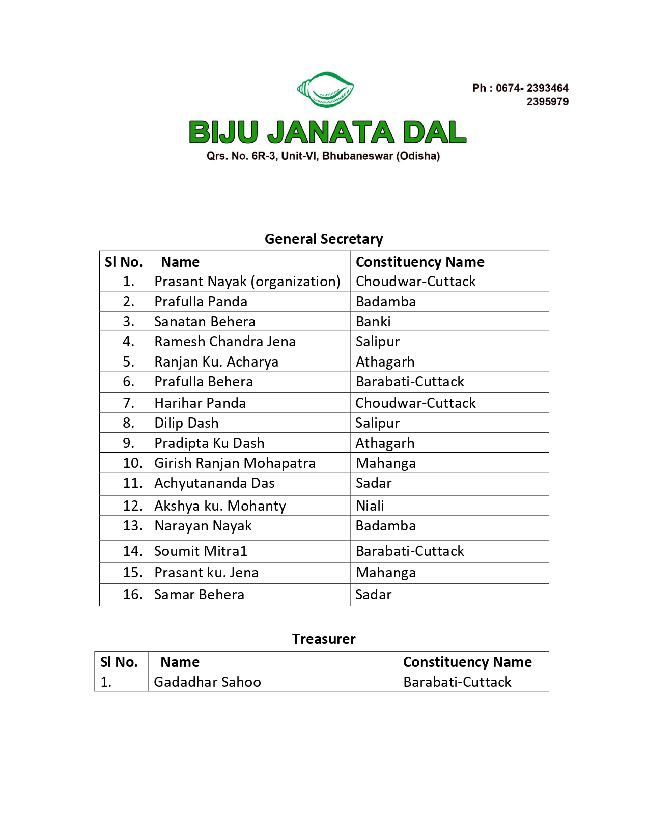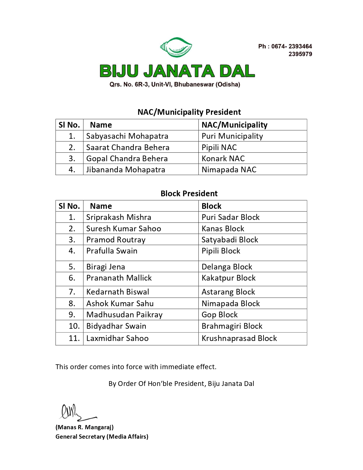 ଭୁବନେଶ୍ବର, ଆଜି ବିଜେଡି ତରଫରୁ ଦୁଇଟି ଜିଲ୍ଲାର କର୍ମକର୍ତ୍ତାଙ୍କ ନାମ ଘୋଷଣା କରାଯାଇଛି। ଏହି ଦୁଇଟି ଜିଲ୍ଲା ହେଲା କଟକ ଏବଂ ପୁରୀ। ଏହି ଦୁଇ ଜିଲ୍ଲାରେ ପ୍ରାୟ 102 ଜଣଙ୍କ ନାମ ପ୍ରକାଶ ପାଇଛି। ଜାଣନ୍ତୁ କେଉଁମାନଙ୍କୁ ଦଳ ବିଭିନ୍ନ ପଦପଦବୀରେ ନିଯୁକ୍ତ ଦେଇଛି।