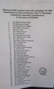 Nuapada Byelection: ଆଜି ବିଜେପି ନୂଆପଡା ଉପନିର୍ବାଚନ ପାଇଁ 40 ଜଣିଆ ଷ୍ଟାର ପ୍ରଚାରକ ତାଲିକା ପ୍ରକାଶ କରିଛି। ଏହି ନେତାମାନେ ଜୟ ଢୋଲକିଆଙ୍କ ପାଇଁ ପ୍ରଚାର କରିବେ। ତେବେ ଏହି ତାଲିକାରେ ଓଡିଶା ମୁଖ୍ୟମନ୍ତ୍ରୀଙ୍କ ସହିଚ ଛତିଶଗଡ ମୁଖ୍ୟମନ୍ତ୍ରୀ ମଧ୍ୟ ଅଛନ୍ତି।