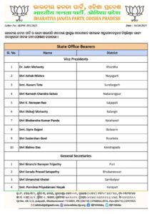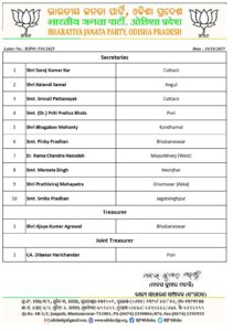ସେହିପରି ଦଳ 10 ଜଣଙ୍କୁ ସଂପାଦକ ଭାବେ ନିଯୁକ୍ତି ପ୍ରଦାନ କରିଛି। କୋଷାଧ୍ୟକ୍ଷ ଭାବେ ଅଜୟ କୁମାର ଅଗ୍ରୱାଲ ଏବଂ ଉପକୋଷାଧ୍ୟକ୍ଷ ଭାବେ ଦିବାକର ହରିଚନ୍ଦନ ନିଯୁକ୍ତ ହୋଇଛନ୍ତି।