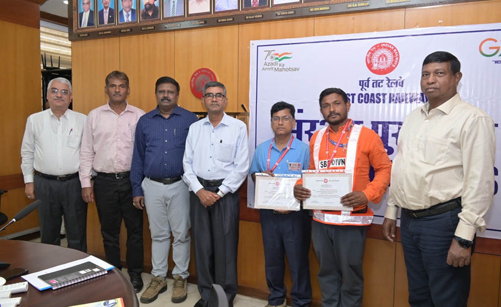 ଭୁବନେଶ୍ୱର: ସୁରକ୍ଷିତ ଟ୍ରେନ ପରିଚାଳନା ସୁନିଶ୍ଚିତ କରିବାରେ ଅସାଧାରଣ ସତର୍କତା ଏବଂ ସମର୍ପଣ ପାଇଁ ପୂର୍ବତଟ ରେଳପଥ ମହାପ୍ରବନ୍ଧକ ଶ୍ରୀ ପରମେଶ୍ୱର ଫୁଙ୍କୱାଲ ଦୁଇ ଜଣ ରେଳ କର୍ମଚାରୀଙ୍କୁ ସମ୍ମାନିତ କରିଛନ୍ତି।