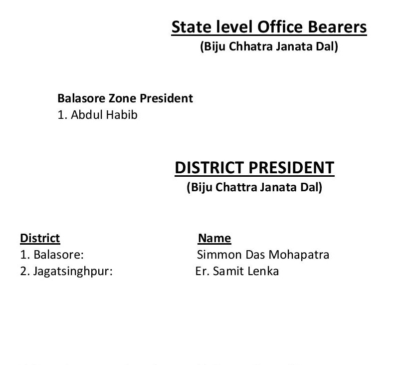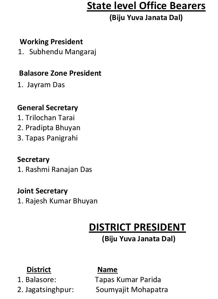 ଭୁବନେଶ୍ବର, ଆଜି ବିଜୁ ଯୁବ ଜନତା ଦଳ ଏବଂ ବିଜୁ ଛାତ୍ର ଜନତା ଦଳ ପାଇଁ ଦଳ ତରଫରୁ ନୁଆ ନିଯୁକ୍ତି ପ୍ରଦାନ କରାଯାଇଛି। ଦଳର ସଭାପତି ନବୀନ ପଟ୍ଟନାୟକଙ୍କ ସ୍ବୀକୃତି କ୍ରମେ ଏହି ନିଯୁକ୍ତି ପ୍ରଦାନ କରାଯାଇଛି। ଯାହାଙ୍କୁ ନୂଆ ନିଯୁକ୍ତି ମିଳିଲା ତାହା ହେଲା