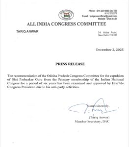 ଭୁବନେଶ୍ବର: ନୂଆପଡା ଉପନିର୍ବାଚନ ପରେ ରାଜ୍ୟ କଂଗ୍ରେସ ଏକ ବଡ ନିଷ୍ପତି ଗ୍ରହଣ କରିଛି। ସେହି ଅନୁସାରେ ଆଜି କଂଗ୍ରେସ ନେତା ପଦ୍ମାକର ଗୁରୁଙ୍କୁ ଦଳ ବହିସ୍କାର କରିଛି। ତାଙ୍କୁ ଛଅ ବର୍ଷ ପାଇଁ ଦଳରୁ ବହିସ୍କାର କରାଯାଇଛି। ଏ ନେଇ ଦଳତରଫରୁ ଏକ ବିଜ୍ଞପ୍ତି ପ୍ରକାଶ କରି ସୂଚନା ଦିଆଯାଇଛି। ଜାତୀୟ କଂଗ୍ରେସର ସଚିବ ସଦସ୍ୟ ତାରିକ ଅନୱାରଙ୍କ ଦସ୍ତଖତରେ ଏହି ବିଜ୍ଞପ୍ତି ପ୍ରକାଶ ପାଇଛି।