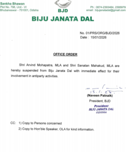 ଏହି ବିଜ୍ଞପ୍ତିରେ କୁହାଯାଇଛି ଯେ, ବିଧାୟକ ଅରବିନ୍ଦ ମହାପାତ୍ର ଏବଂ ବିଧାୟକ ସନାତନ ମହାକୁଡଙ୍କୁ ଦଳ ବିରୋଧୀ କାର୍ଯ୍ୟ ପାଇଁ ଦଳରୁ ନିଲମ୍ବିତ କରାଯାଇଛି। ଏଥିରେ ଖୋଦ ସଭାପତି ନବୀନ ପଟ୍ଟନାୟକ ଦସ୍ତଖତ କରିଛନ୍ତି। ଏହି ନିଲମ୍ବନ ସଂପର୍କରେ ବିଧାନସଭା ବାଚସ୍ପତିଙ୍କୁ ଅବଗତ କରାଯାଇଛି।