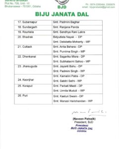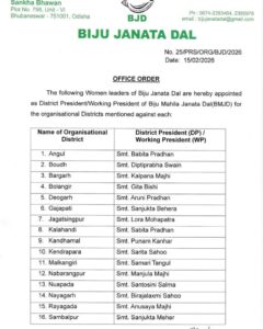 ଭୁବନେଶ୍ବର: ଆଜି ମହାଶିବରାତ୍ରିରେ ବିଜୁ ଜନତା ଦଳ ଘୋଷଣା କରିଛି ତାହା ମହିଳା ବାହିନୀର ନାମ। ବିଜୁ ମହିଳା ଜନତା ଦଳର କର୍ମକର୍ତ୍ତାଙ୍କ ନାମ। ଏଥିରେ ଜିଲ୍ଲା ସଭାପତିଙ୍କ ନାମ ସହିତ ଜୋନାଲ ସଭାପତିଙ୍କ ନାମ ମଧ୍ୟ ଘୋଷଣା କରାଯାଇଛି। ଯେଉଁ ଜିଲ୍ଲାରୁ ମହିଳା ସଭାପତି ଭାବେ ନିଯୁକ୍ତି ଦିଆଯାଇଛି ସେମାନେ ହେଲେ..