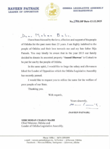 Previously our family decided to donate its ancestral property ‘Anand Bhawan’ in Cuttack. In the same spirit, I would like to forgo the salary and allowances hiked for Leader of Opposition which the Odisha Legislative Assembly has recently passed. I would like to request Honorable CM Shri @MohanMOdisha