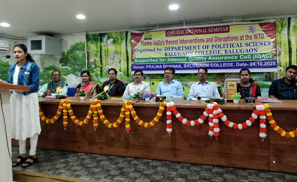ବାଲୁଗାଁ: ବାଲୁଗାଁ ମହାବିଦ୍ୟାଳୟର ରାଜନୀତି ବିଜ୍ଞାନ ବିଭାଗ ପକ୍ଷରୁ ଆଜି “ବିଶ୍ୱ ବାଣିଜ୍ୟିକ ସଂଗଠନର ପରିଚାଳନାରେ ଭାରତର ହସ୍ତକ୍ଷେପ ଓ ବିଘଟନ” ଶୀର୍ଷକ ଜାତୀୟ ଆଲୋଚନାଚକ୍ର ଅନୁଷ୍ଠିତ ହୋଇଯାଇଛି। ପ୍ରାରମ୍ଭରେ ଅତିଥିମାନେ ଶ୍ରୀଜଗନ୍ନାଥଙ୍କ ମୂର୍ତ୍ତି ନିକଟରେ ପ୍ରଦୀପ ପ୍ରଜ୍ବଳନ ପୂର୍ବକ ଏହି ଆଲୋଚନଚକ୍ରକୁ ଉଦଘାଟନ କରିବାପରେ ଅଧ୍ୟକ୍ଷ ଡ଼କ୍ଟର ଲଷ୍ମୀଧର ସୁବୁଦ୍ଧି ଆମନ୍ତ୍ରିତ ଅତିଥିମାନଙ୍କୁ ସମ୍ବର୍ଦ୍ଧିତ କରିଥିଲେ। ଅଧ୍ୟାପିକା ସୁନିତା ନନ୍ଦ ଅତିଥି ପରିଚୟ ପ୍ରଦାନ କରିବା ପରେ ବିଭାଗୀୟ ମୁଖ୍ୟ ଅଧ୍ୟାପକ ସୁବାସ ଶ୍ରୀଚନ୍ଦନ ଭିତ୍ତି ପ୍ରବନ୍ଧ ଉପସ୍ଥାପନ କରିଥିଲେ।